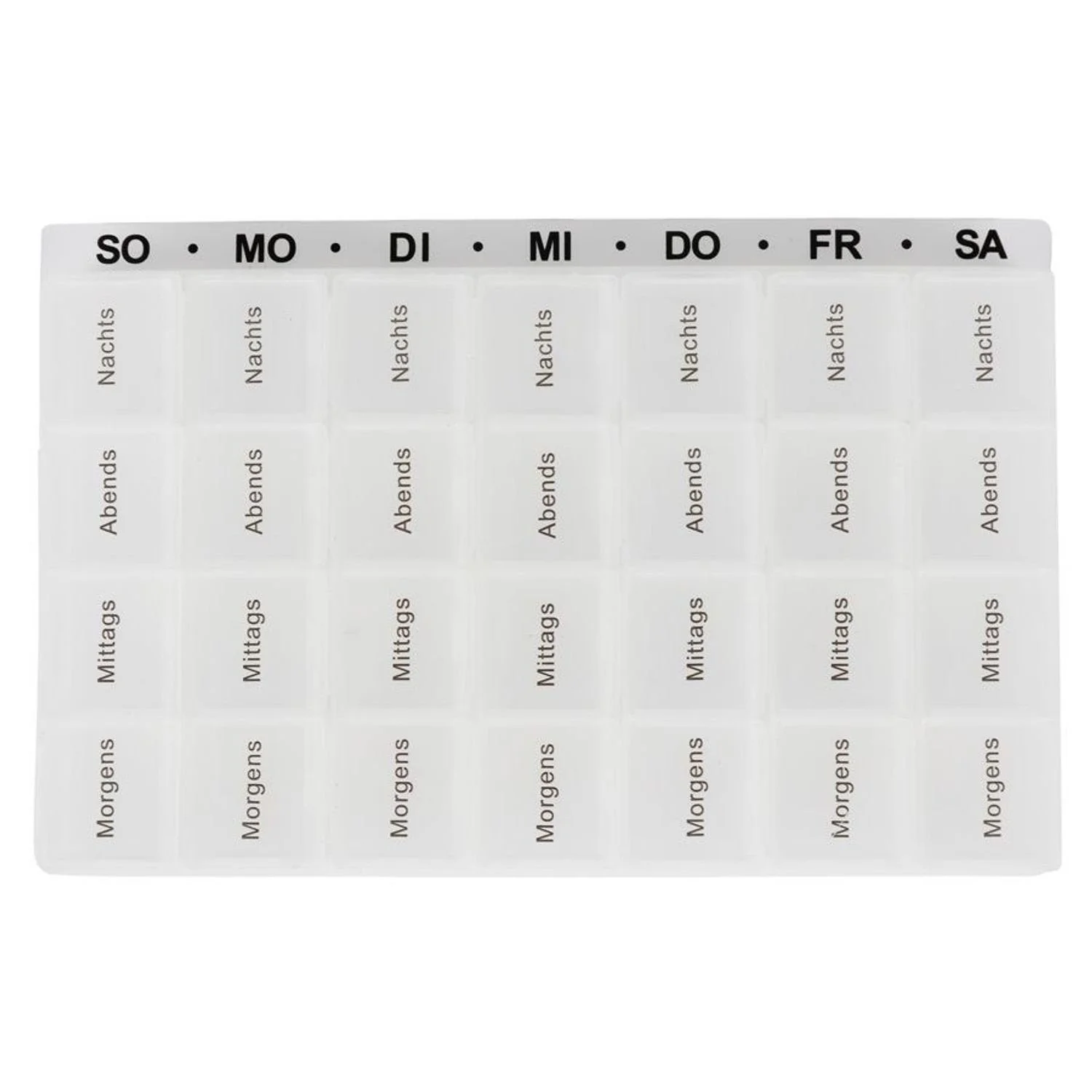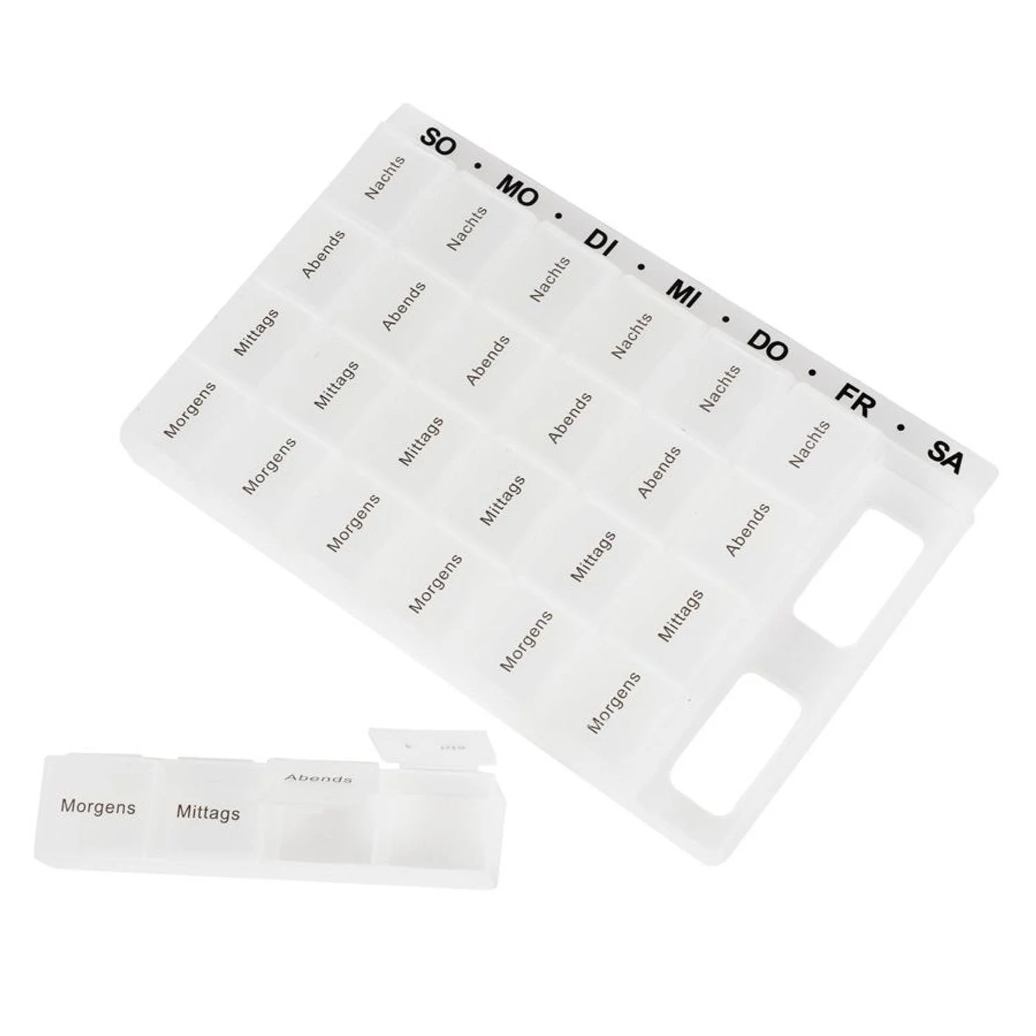 Mit dieser Wochen-Pillendose behalten Sie den Überblick über Ihre Medikamenteneinnahme für sieben Tage. Jede Tagesbox ist in vier Segmente unterteilt – morgens, mittags, abends und nachts – und trägt die entsprechenden Wochentagsangaben. So wird eine regelmäßige Einnahme erleichtert und Fehlzeiten werden vermieden.