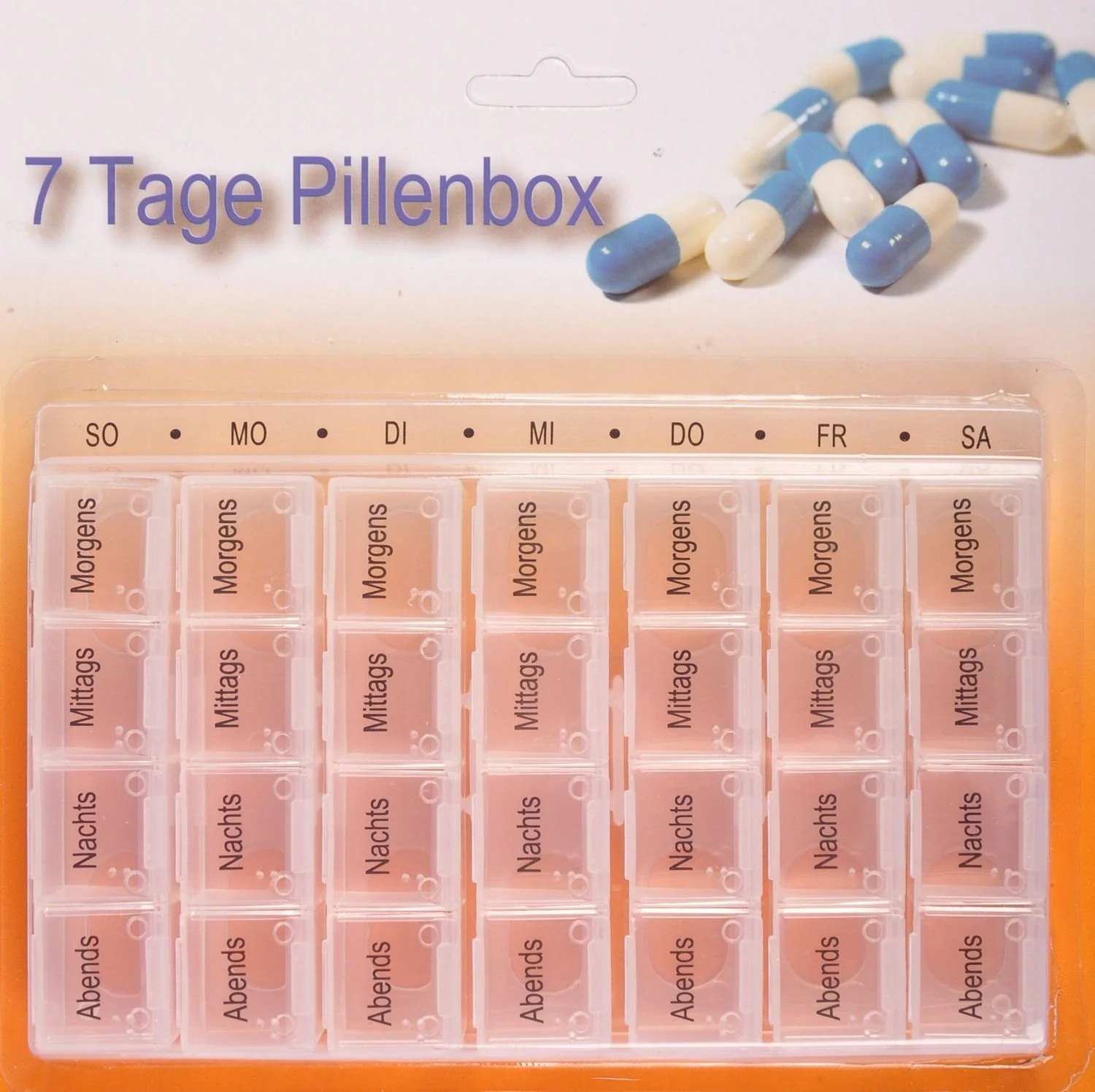 | Im Paket | 1 × Pillenbox für 7 Tage mit herausnehmbaren Tagesboxen |