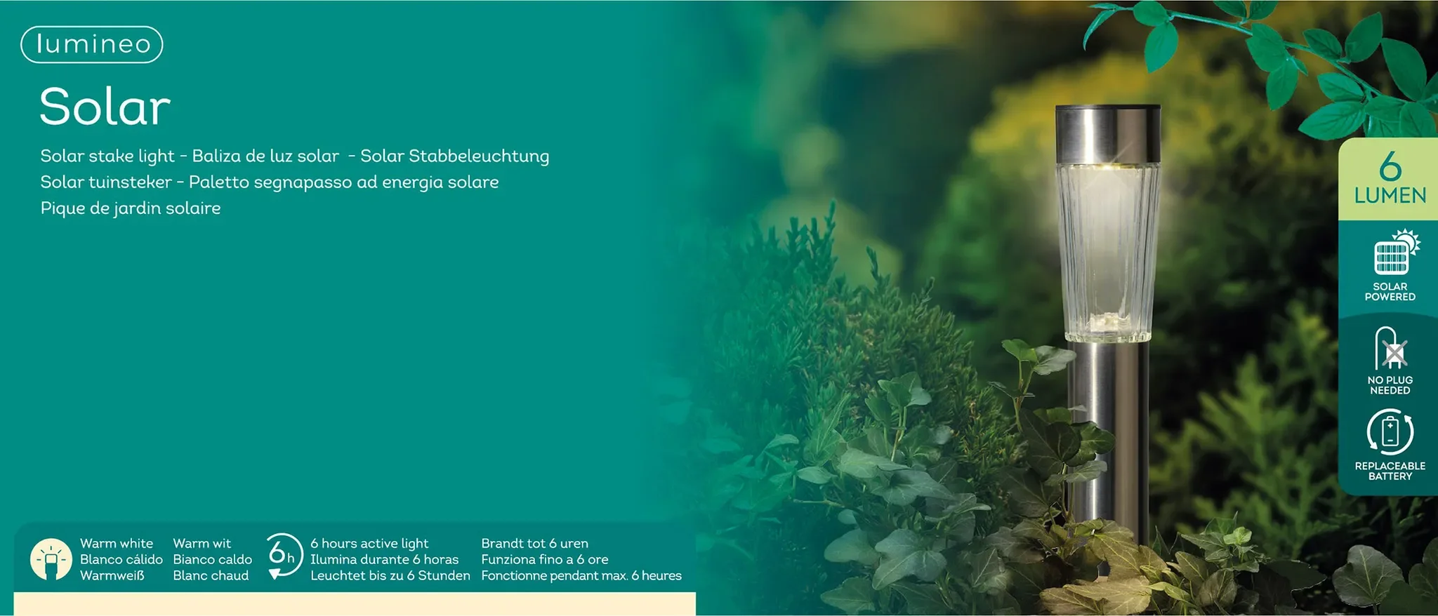 Highlights: Solarbetrieb, warmweißes LED-Licht, Dauerbeleuchtung, Ein-/Ausschalter, Erdspieß für einfache Installation, flexibel umplatzierbar, ideal für Wege, Blumenbeete und Balkone.