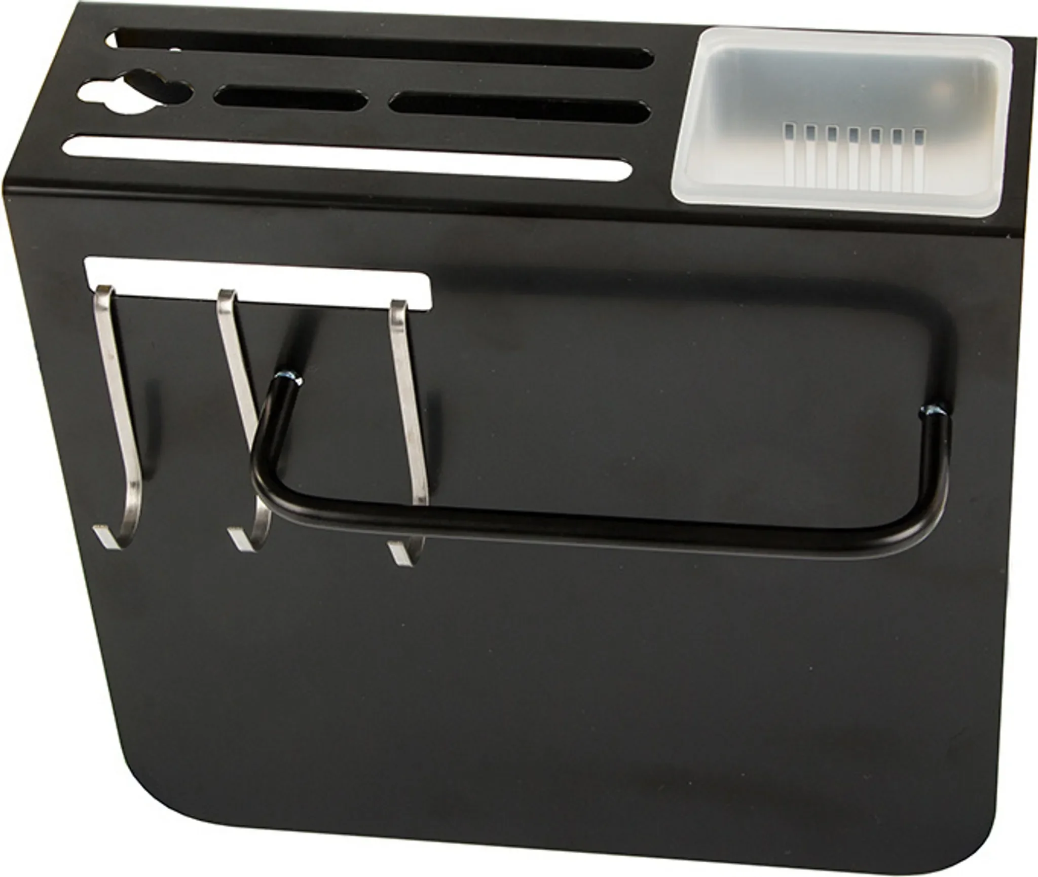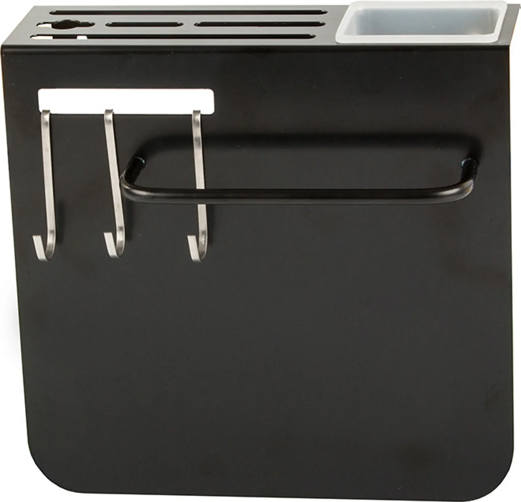 Gefertigt aus pulverbeschichtetem Stahl ist der Organizer robust, pflegeleicht und langlebig. Die Montage kann optional geklebt oder mit Schrauben und Dübeln erfolgen. Zusätzliche Haken und ein Behälter erweitern das Ordnungssystem für Küchenutensilien.