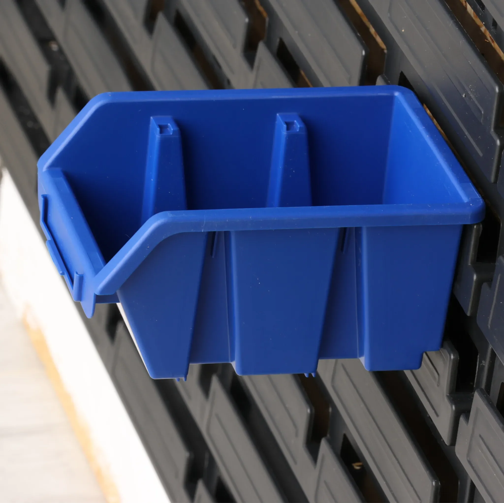 Die Boxen bestehen aus widerstandsfähigem Polypropylen und sind stapelbar. Zusätzlich verfügen sie über rückseitige Haken, um sie an Wandpaneelen oder Regalleisten aufzuhängen. Ein vorgesehener Etikettbereich erleichtert die Kennzeichnung.